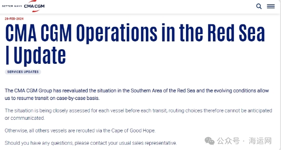 今年(nián)2月2日(rì),由于多艘船(chuán)舶在紅(hóng)海地區遭受襲擊和未遂襲擊,達飛輪船(chuán)暫停了在該地區的航行。