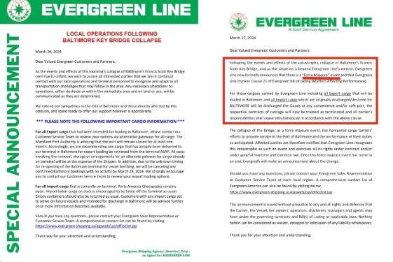 在27日(rì)發布的不可(kě)抗力的公告中表示:巴爾的摩的Francis Scott Key Bridge遭遇災難性坍塌後,鑒于情況超出了EvergreenLine的控制範疇,并根據Evergreen提單第21條作(zuò)爲依據,公司現正式聲明發生(shēng)“不可(kě)抗力”事(shì)件(jiàn)。
