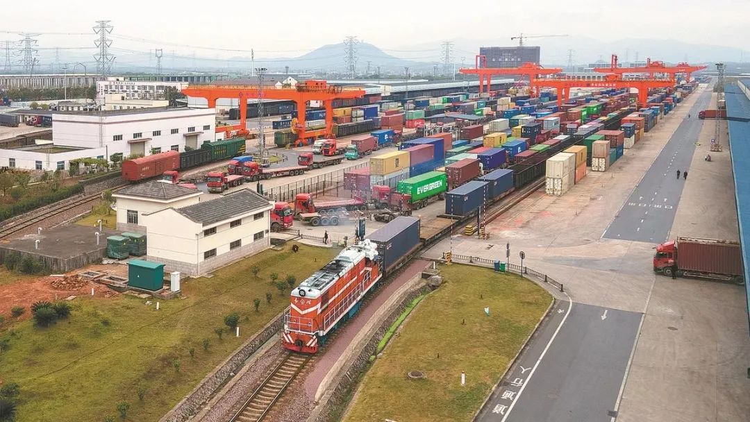 ▲A freight train in Jinhua, Zhejiang province, departs for Laos. Hu Xiaofei/For China Daily