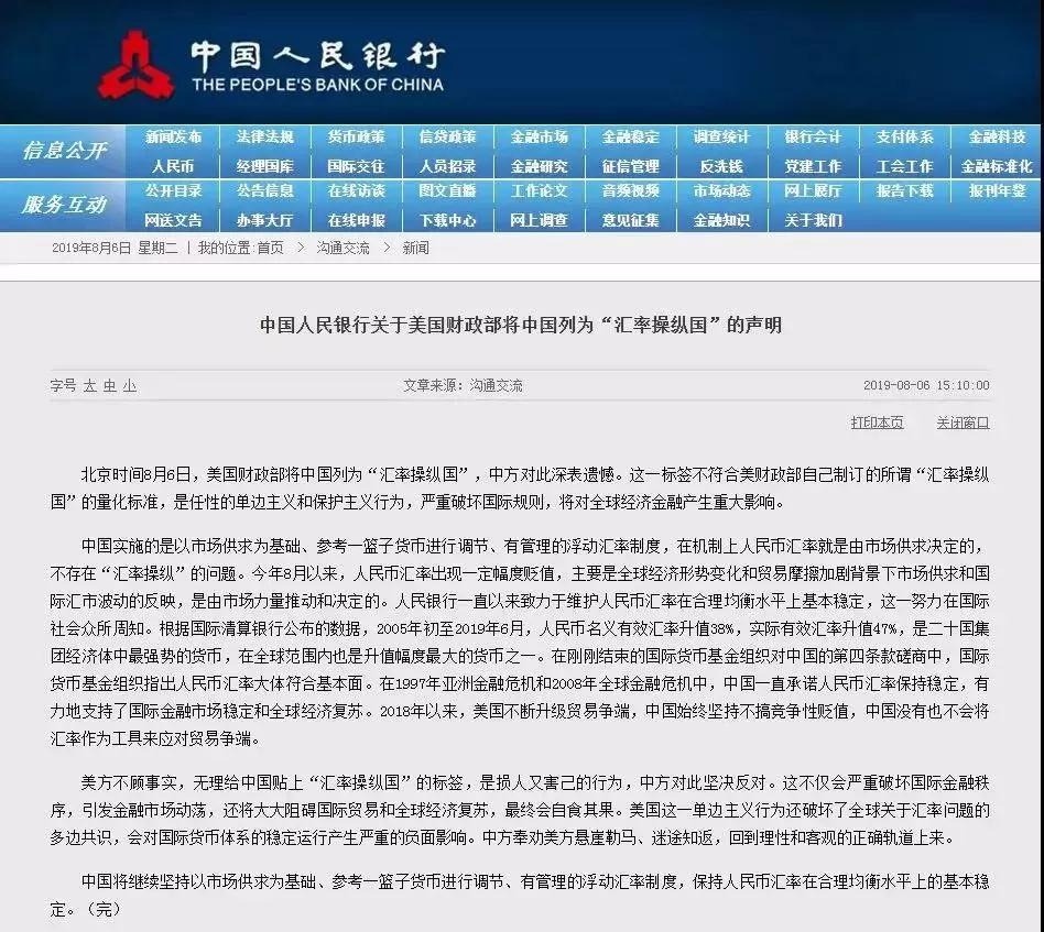 北京時間8月6日(rì),美國(guó)财政部将中國(guó)列爲“彙率操縱國(guó)”,中方對此深表遺憾。這一标簽不符合美财政部自(zì)己制訂的所謂“彙率操縱國(guó)”的量化标準,是任性的單邊主義和保護主義行爲,嚴重破壞國(guó)際規則,将對全球經濟金融産生(shēng)重大(dà)影(yǐng)響。