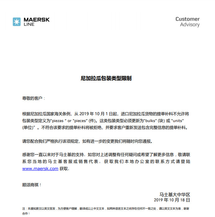 根據尼加拉瓜國(guó)家海關條例,從(cóng)2019年(nián)10月1日(rì)起,進口尼加拉瓜貨物的提單補料不允許将包裝類型定義爲“piezas " or "pieces” (件(jiàn))。這類包裝類型必須更新爲“bulks” (塊) 或 “units”(單位)”。不符合該要求的提單補料将被拒絕,并要求客戶重新發送包含完整信息的提單補料。