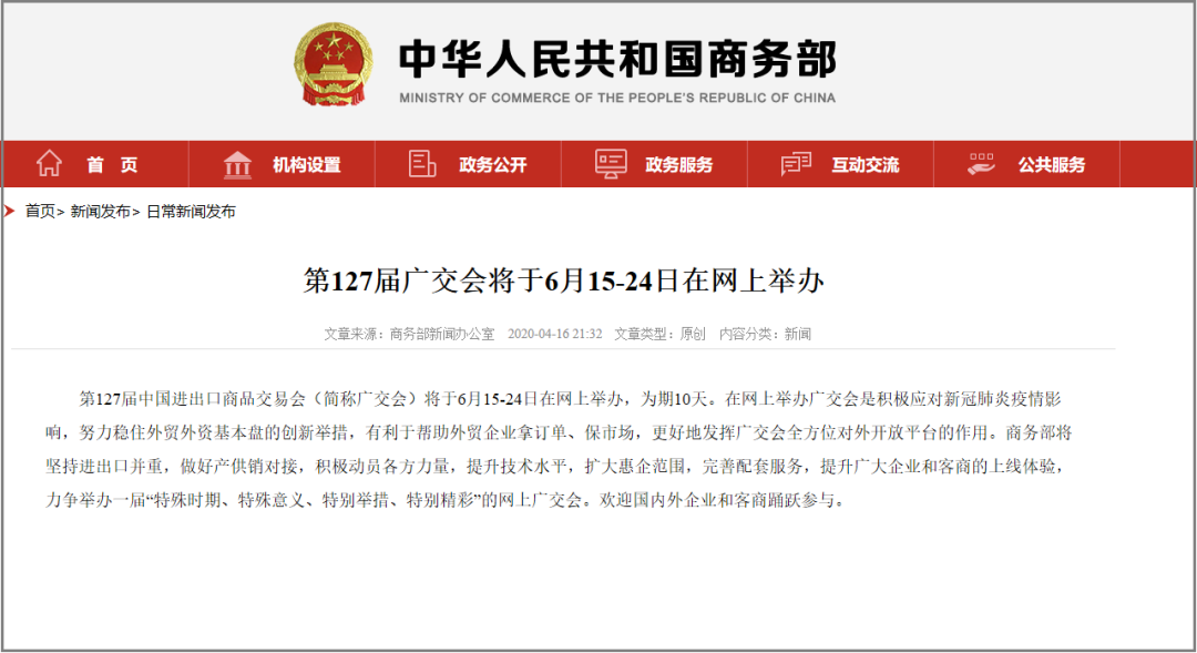 當天,騰訊也在其官方微信公衆号公布了這一消息。在當前疫情形勢下,第127屆廣交會迎來(lái)創新之舉——搬到網上舉辦,這也是我國(guó)首次完全以網絡形式舉辦廣交會。