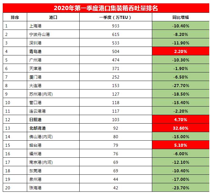由于受新冠疫情的影(yǐng)響,貨物和集裝箱吞吐量均受不同程度影(yǐng)響。集裝箱吞吐量排名前十的港口,隻有青島港達到同比2.2%增幅完成504萬TEU箱量;其他(tā)港口出現不同程度下滑,多數港口達兩位數跌幅,大(dà)連港跌幅更是達到27.7%。值得(de)一提的是,排名第13的北部灣港則出現了高達32.6%的增幅。全國(guó)港口集裝箱吞吐量前20排名如(rú)下表: