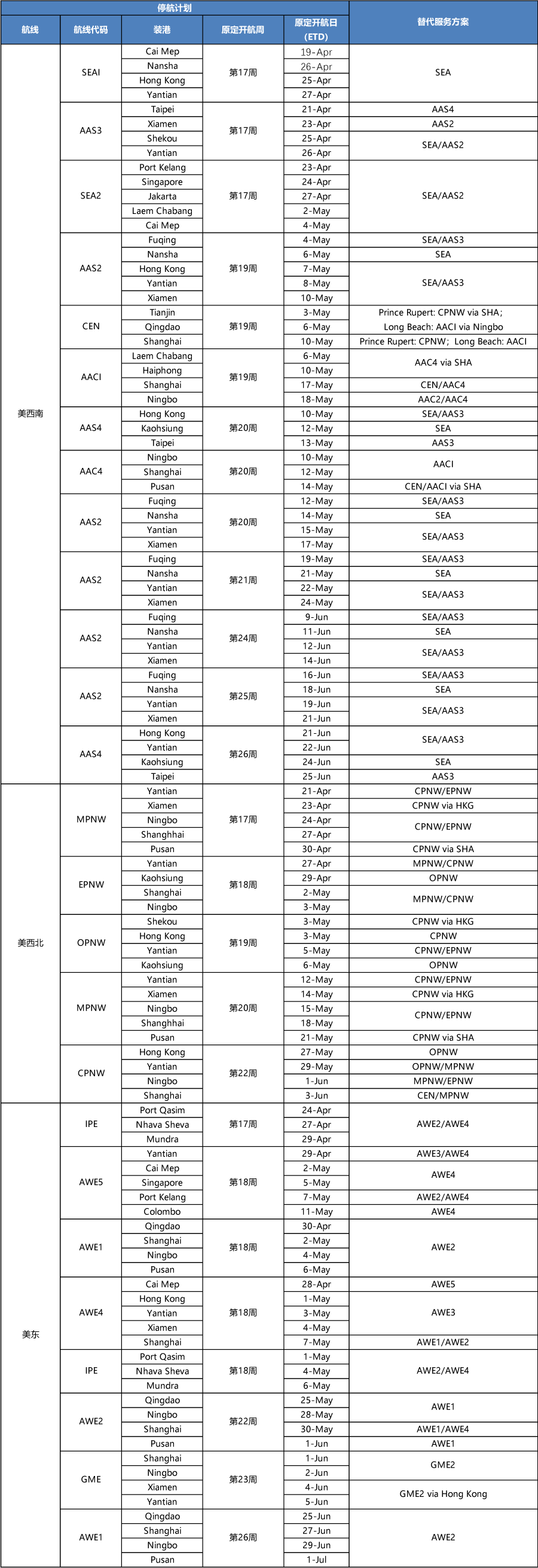 跨太平洋-美西停航計(jì)劃(19-26周PS5暫停)