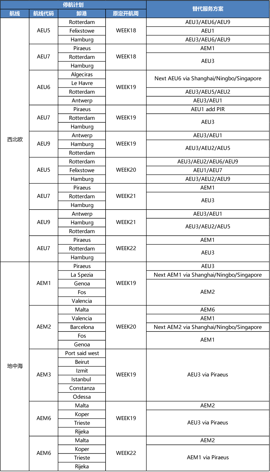 Pusan – Shanghai – Ningbo – Yantian – Singapore – (North Continent Ports rotation subject to berth window availability) – Singapore – Pusan亞洲-地中海停航計(jì)劃: