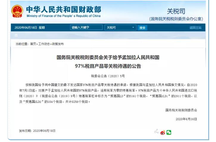 6月18日(rì),【國(guó)務院關稅稅則委員(yuán)會:給予孟加拉國(guó)97%稅目産品零關稅待遇】按照(zhào)我國(guó)給予同中國(guó)建交的最不發達國(guó)家97%稅目産品零關稅待遇的承諾,根據我國(guó)與孟加拉人(rén)民(mín)共和國(guó)換文情況,自(zì)2020年(nián)7月1日(rì)起,對原産于孟加拉人(rén)民(mín)共和國(guó)的97%稅目産品,适用稅率爲零的特惠稅率。