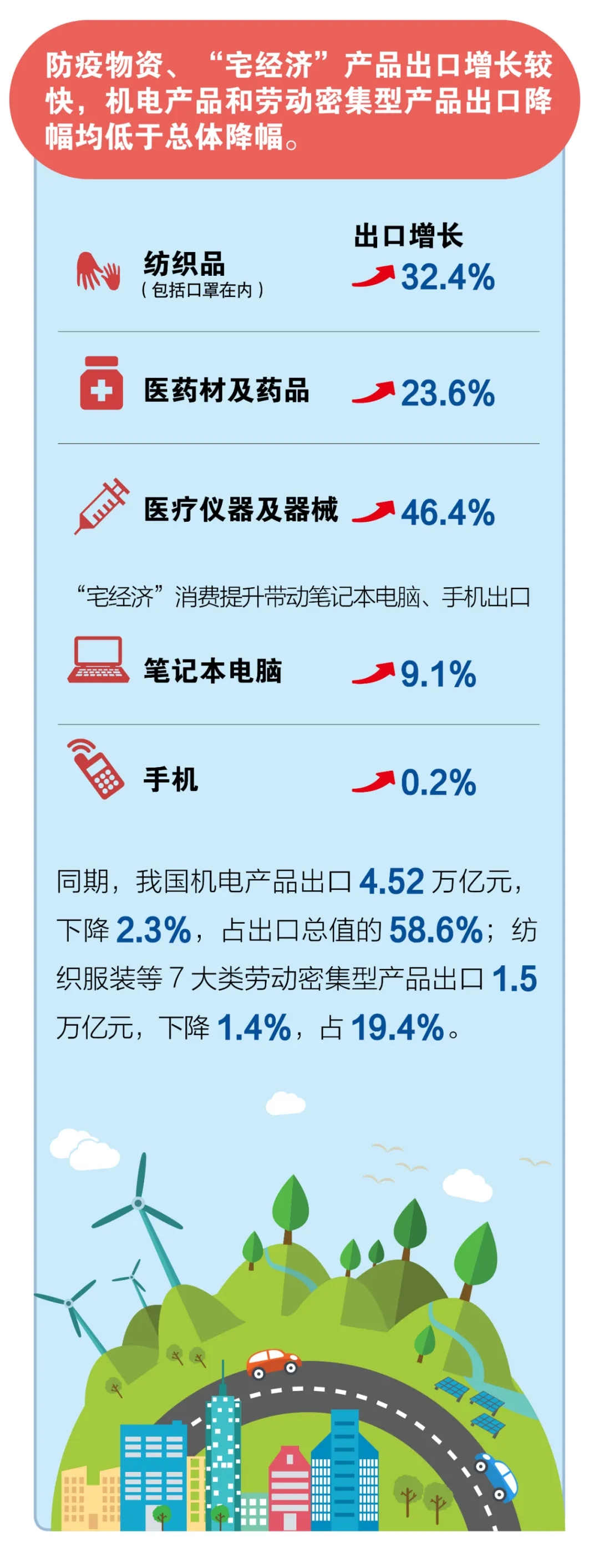 二是防疫物資、手機(jī)等出口向好。今年(nián)以來(lái),完善出口退稅政策、增加外貿信貸投放(fàng)、加大(dà)出口信用保險支持、增設跨境電商綜合試驗區、支持出口轉内銷等一系列政策措施落地見(jiàn)效,幫助外貿企業渡難關、保市場、保訂單,有力促進了出口。二季度出口值達到4.38萬億元,同比增長4.5%,防疫物資等出口快(kuài)速增長。上半年(nián)包括口罩在内的紡織品出口增長32.4%,醫藥材及藥品、醫療儀器及器械出口分(fēn)别增長23.6%和46.4%。同時,受疫情防控影(yǐng)響,也帶動了“宅經濟”消費提升,相(xiàng)關産品如(rú)筆記本電腦、手機(jī)上半年(nián)出口分(fēn)别增長了9.1%和0.2%。