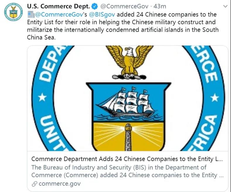 突發!美國(guó)商務部網站(zhàn)剛剛發布一份新聞稿,宣稱将24家中國(guó)企業列入制裁名單,原因是這些企業參與在南(nán)海修建人(rén)工(gōng)島。
