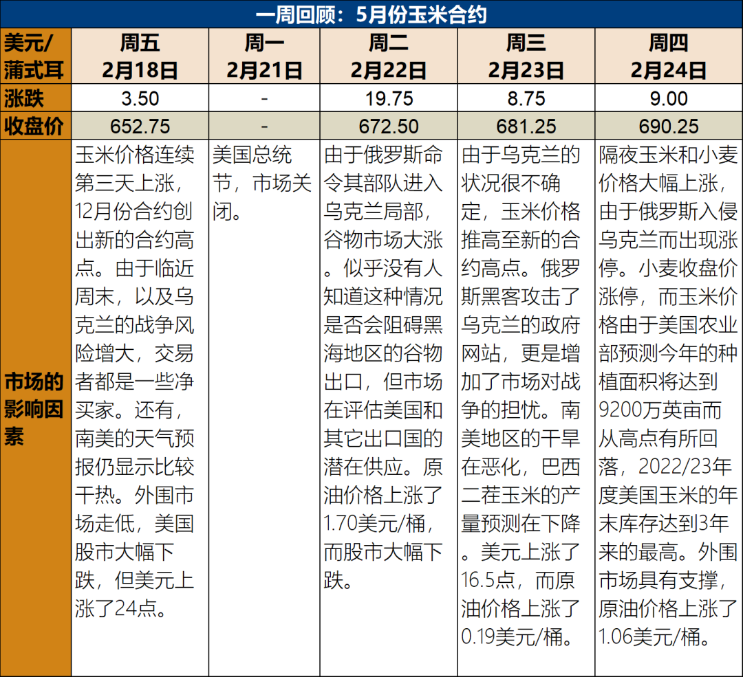 展望:本周5月份玉米合約價格上漲了37.50美分(fēn)/蒲式耳(5.7%),俄羅斯入侵了烏克蘭。烏克蘭作(zuò)爲一個重要的糧食出口國(guó),今年(nián)預計(jì)出口總計(jì)5750萬噸的玉米和小麥,随着周四早晨俄羅斯的入侵,出口港口已經關閉。在入侵發生(shēng)後的第一個交易日(rì),其對全球出口貿易的威脅使得(de)玉米和小麥期貨都(dōu)創出新的合約高點。周四,新作(zuò)和陳作(zuò)玉米小麥期貨都(dōu)創出合約新高,5月份玉米期貨的日(rì)内高點爲7.1625美元/蒲式耳。玉米期貨,不管是陳作(zuò)還(hái)是新作(zuò)玉米,都(dōu)從(cóng)日(rì)内的漲停點回落,5月份合約收盤價上漲了9美分(fēn)/蒲式耳,而9月份合約收盤價下跌了8美分(fēn)/蒲式耳。
