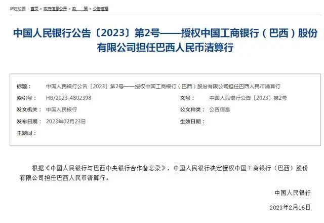 今年(nián)年(nián)初,中國(guó)和巴西簽署了在巴西建立人(rén)民(mín)币清算安排的合作(zuò)備忘錄。2月23日(rì),中國(guó)人(rén)民(mín)銀行發布公告,授權工(gōng)銀巴西擔任巴西人(rén)民(mín)币清算行