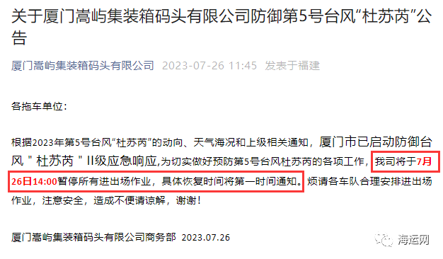 各拖車單位:廈門(mén)市已啓動防禦台風(fēng)"杜蘇芮"II級應急響應,2023年(nián)7月26日(rì)14:00起廈門(mén)集裝箱碼頭集團各成員(yuán)企業(海天、海潤、嵩嶼、國(guó)際貨櫃、海通、新海達、海翔)停止受理(lǐ)閘口交提箱業務,恢複作(zuò)業時間另行通知,敬請(qǐng)互相(xiàng)轉告,謝謝!