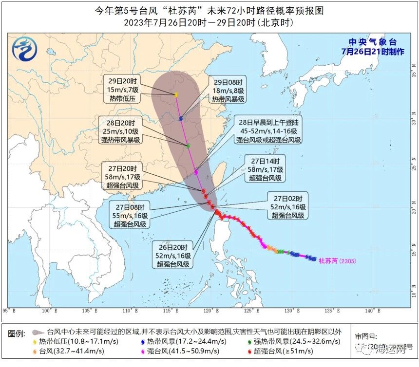 中央氣象台7月26日(rì)發布台風(fēng)紅(hóng)色預警:今年(nián)第5号台風(fēng)“杜蘇芮”(DOKSURI)(超強台風(fēng)級),将于今天早晨移入南(nán)海東北部,強度将有所增強,然後逐漸向福建福清到廣東惠來(lái)一帶沿海靠近,并将于28日(rì)早晨到上午在上述沿海地區登陸,最大(dà)可(kě)能在福建晉江到閩粵交界沿海登陸(強台風(fēng)級或超強台風(fēng)級,45-52米/秒,14-16級)。