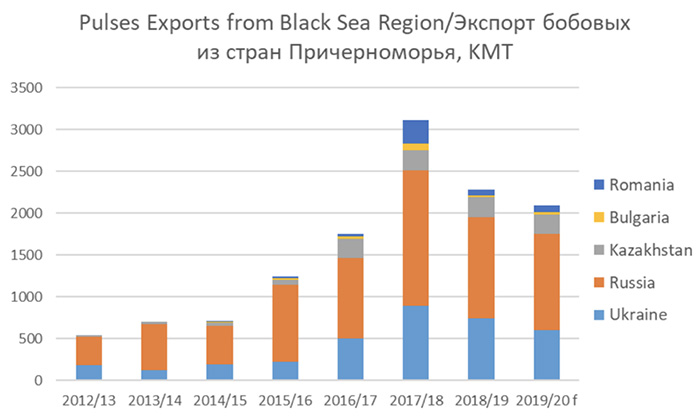 In his presentation, Feofilov focused on the Black Sea Region’s pulse production and exports in recent campaigns. After peaking in 2017/18, the region’s exports fell off in 2018/19 and are projected to slip further in 2019/20. Ukraine, however, is seeing interesting new developments. The country is primarily a dry pea exporter, and its recent drop off in overall pulse exports is due to decreased dry pea production. At the same time, however, it is seeing increased exports in other pulse products, namely kidney beans, chickpeas and lentils. In fact, Ukraine has emerged as the region’s top kidney bean exporter.